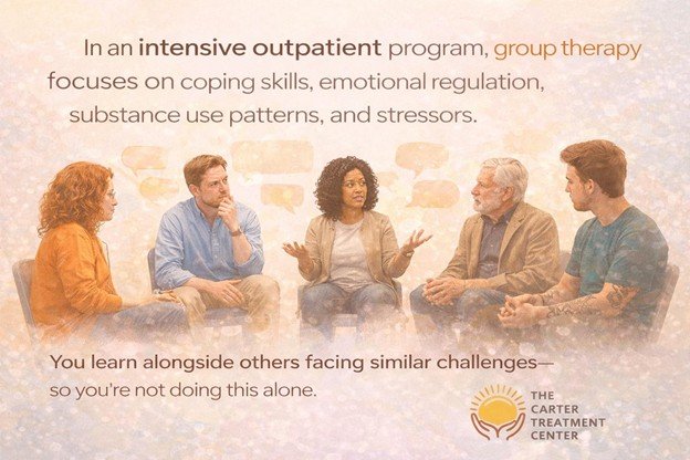 Most of the time in an intensive outpatient program is spent in group therapy. These groups focus on coping skills, emotional regulation, substance use patterns, and real-life stressors.